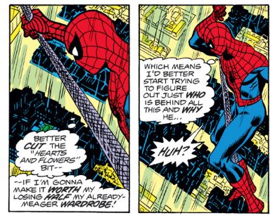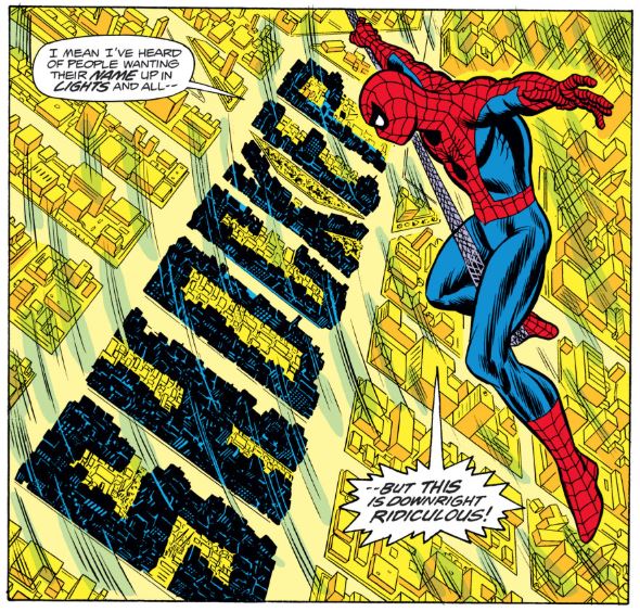 Y es que la página comienza a abrir el plano, revelando al mismo tiempo que Spidey va razonando, contrastando su traje rojo y azul con el intenso amarillo de la ciudad de Nueva York.