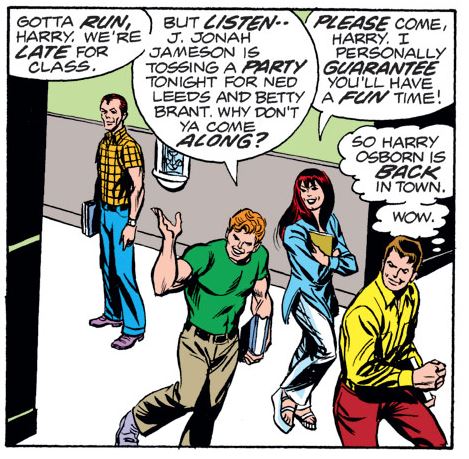 Peter Parker y sus amigos universitarios asistiendo a una fiesta en casa de J. Jonah Jameson. Esta clase de detalles, con tebeos con más páginas dedicadas a Peter rodeado de su elenco de secundarios civiles que a las peleas de señores en pijama, son los que caracterizaron los años más nostálgicos del personaje. Aquí los tenemos a todos: Mary Jane, Harry; Flash, Ned, Betty, y por supuesto, al mismísimo anfitrión: