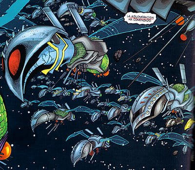 3. No he leído el tebeo, pero viendo en la imagen que se trata de una especie de naves-insecto, yo diría que en el original más bien pone «Swarming» y que se refiere al «enjambre». Nada que ver con el «calentamiento» («Warming»).