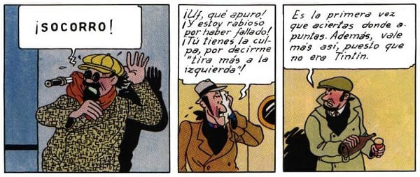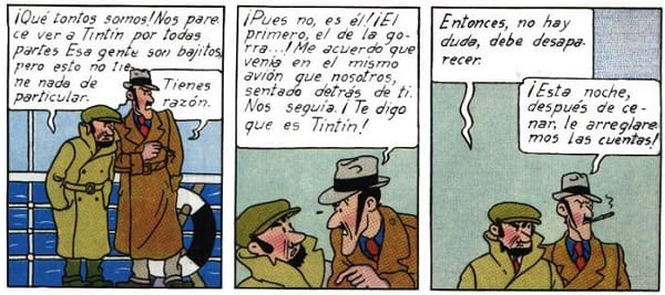 En el álbum de Las aventuras de Tintín «La oreja rota» nos encontramos con un par de malhechores genéricos en un barco convencidos de que el citado reportero los está siguiendo