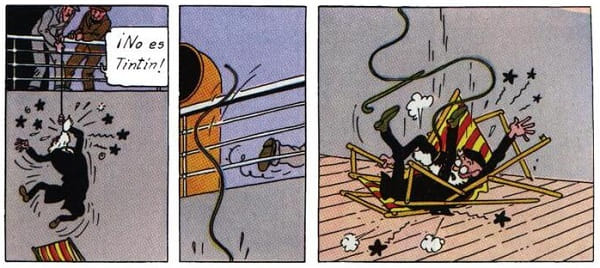 Esto les hace deducir que Tintín no está a bordo, y se confían. Con desastrosas consecuencias para ellos, porque el susodicho sí estaba a bordo, disfrazado de Moreno