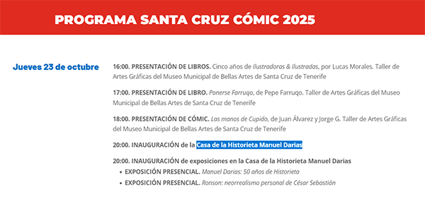 -La fecha y hora de la ceremonia indicadas en el programa del Santa Cruz Cómic 2025.