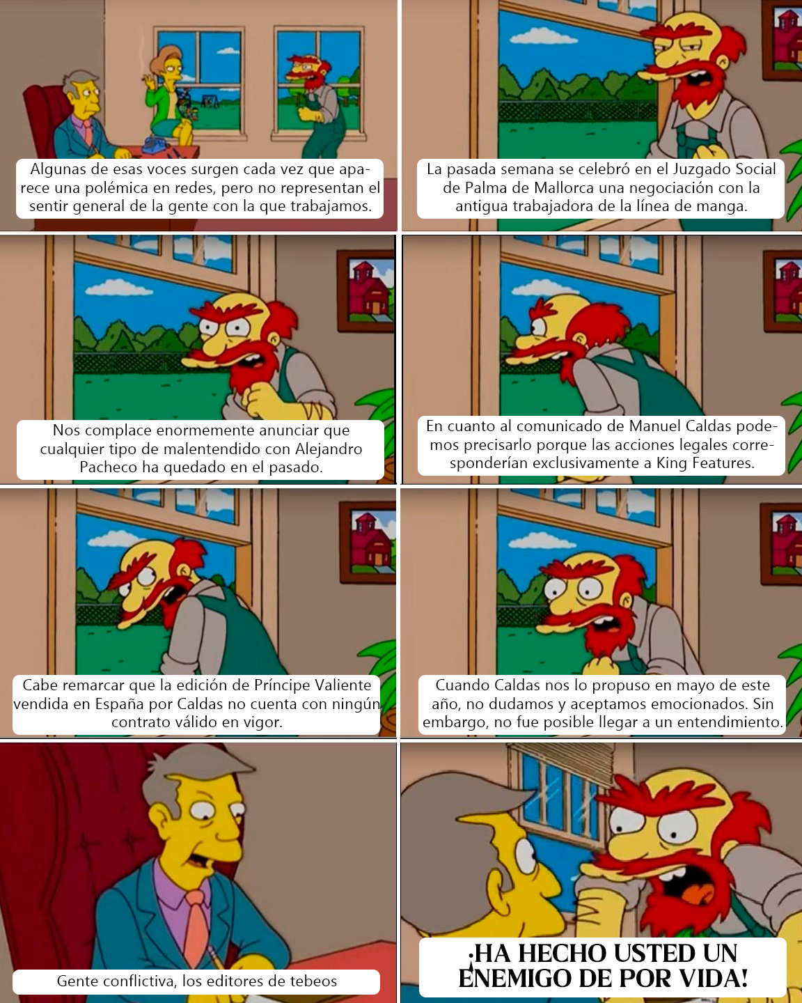 «Sobre el conflicto en cuestión, nuestra intención inicial fue siempre respetar las medidas del formato que Caldas propuso, pero asumimos —erróneamente— que su idea era hacerla en un formato más grande. Fallamos por no comprobarlo antes con una simple regla y aplicar simplemente el sentido común. Porque la lógica señala que reproducir la obra de Foster en un formato reducido, ni haría justicia al dibujo original, ni competiría con nuestra edición en color«