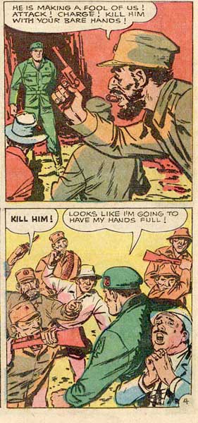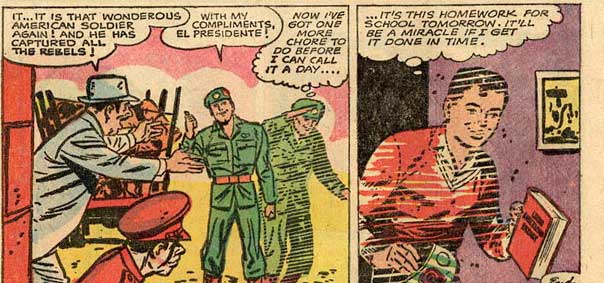 La escena transcurre en un pequeño país sudamericano, porque si algo nos ha enseñado la industria estadounidense es que en los países sudamericanos grandes jamás ha pasado nunca nada dijera lo que dijera ese rojo de Oesterheld, en el que sin embargo no todo es alegría y presidentes que se desviven por sus conciudadanos. Tod Holton es un cómic divulgativo y, por lo tanto, se esfuerza en mostrar las cosas de la forma más objetiva, y por lo tanto no le duelen prendas en explicar que en Sudamérica hay gente buena, y gente mala, como en todas partes, y que uno distingue a unos de otros por…