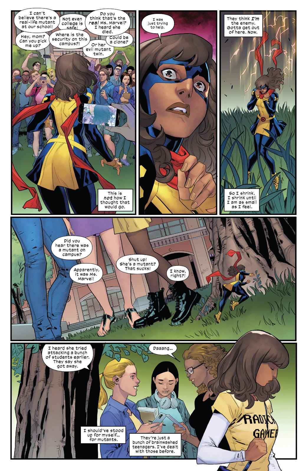 Todo iba bien para Carlos, que se convirtió en dibujante de Amazing Mary Jane con Leah Williams, Black Widow con Kelly Thompson y America Chavez: Made In The USA con Kalinda Vazquez. Ha dibujado muchas señoras a lo largo de su carrera, tiene hasta una etapa destacada con Red Sonja. También se paseó por Amazing Spider-Man en los últimos estertores de la era de Nick Spencer. Es decir, The Chameleon Conspiracy y Sinister War. Hasta continuó en los inicios de Zeb Wells en la serie durante la etapa Beyond, aunque dibujó los guiones de otros como Jed MacKay, Cody Ziglar o Saladin Ahmed. Volvió a reunirse con Leah Williams para dibujar más señoras en X-Terminators, se encargó de Rogue & Gambit con Stephanie Phillips y hasta colaboró con Iman Vellani y Sabir Pirzada en Ms. Marvel: The New Mutant, la primera miniserie de Kamala Khan en su nuevo statu quo como mutante. Con páginas como esta.