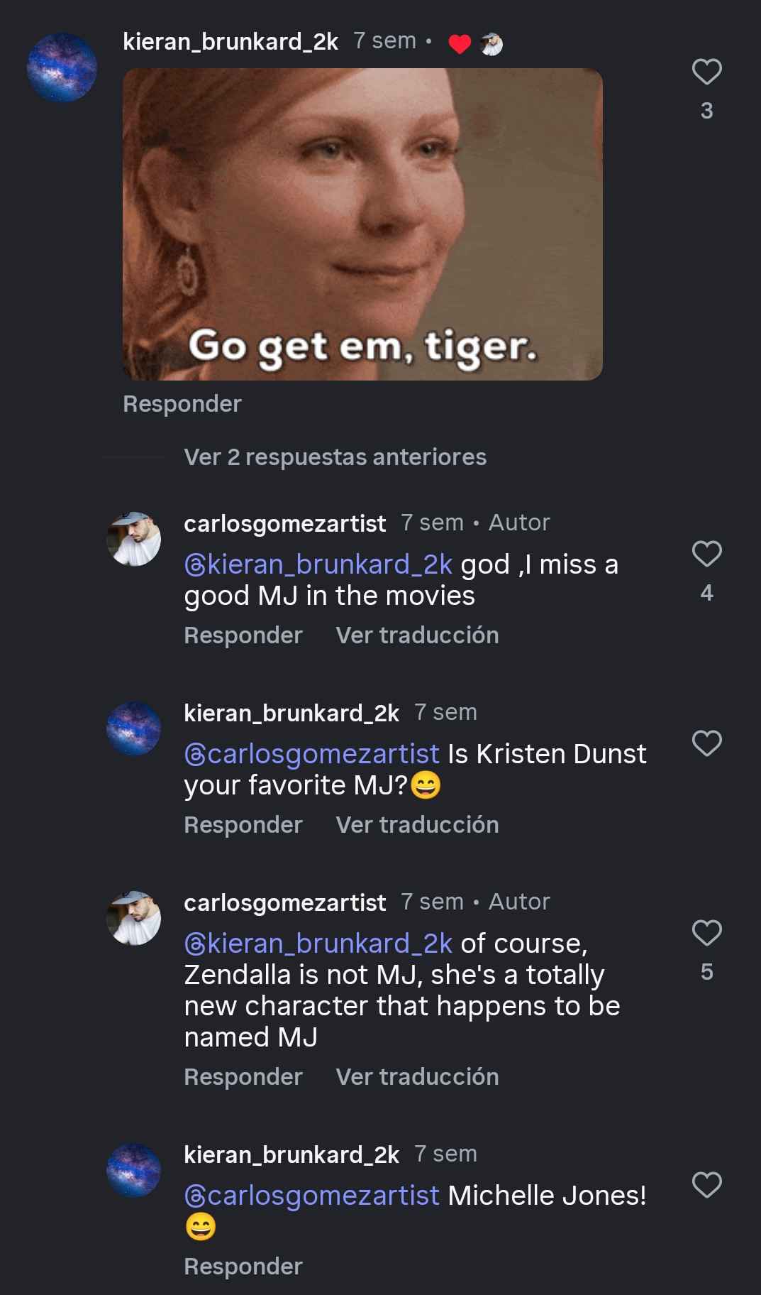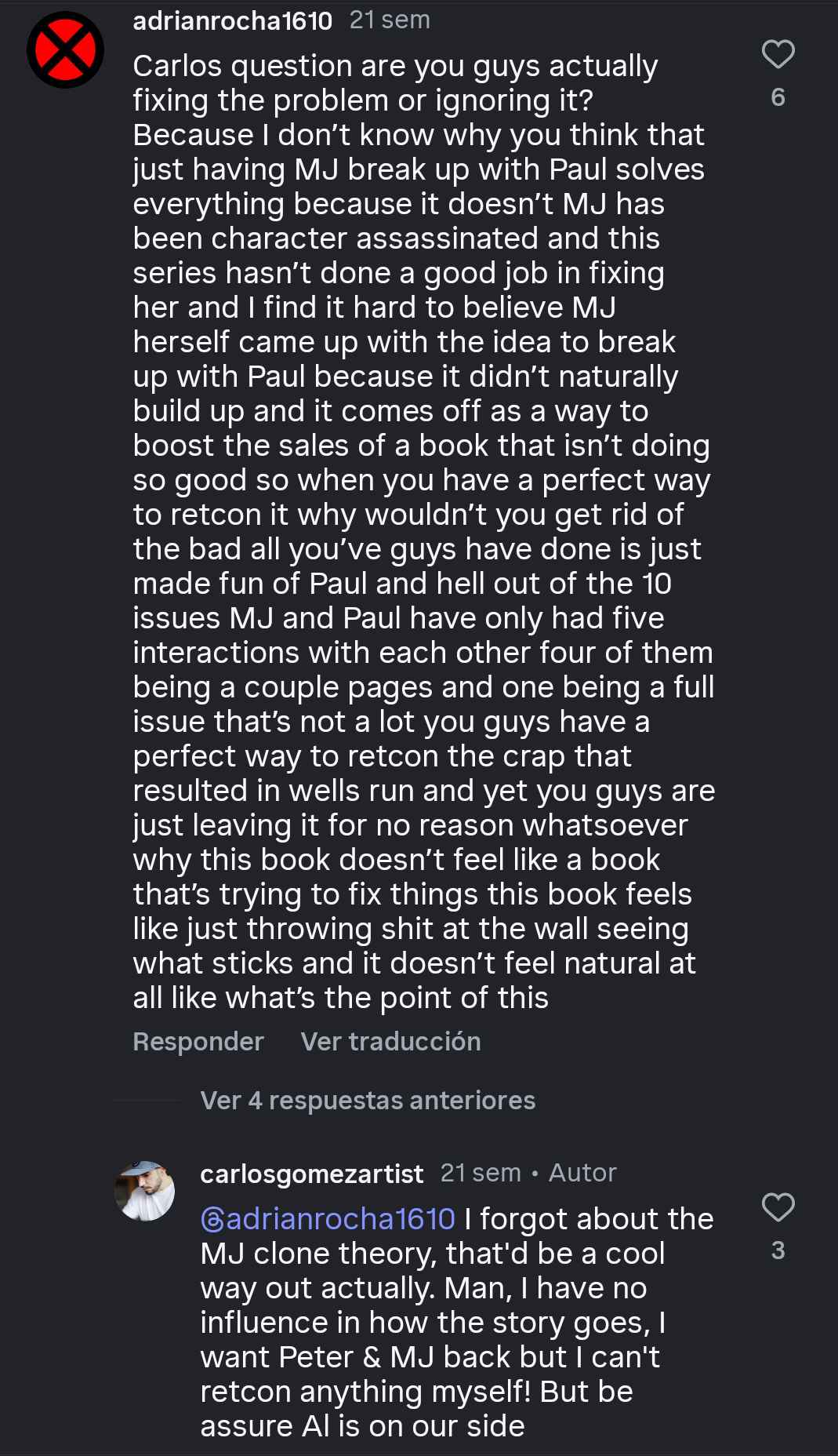 Recordemos que Carlos Gómez es un artista profesional pagado por Marvel Comics. Está hablando del trabajo de compañeros. Dando like y respondiendo a comentarios así, validando expresiones «3 years of shit», «3 años de pesadilla» o «awful writer». ¿Qué manera de tratar a Zeb Wells es esta?