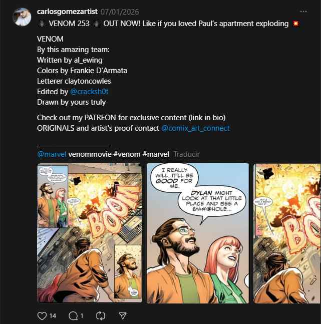 Tras unos números en Fantastic Four de Ryan North, su gran momento llegó con All-New Venom, colección guionizada por Al Ewing en la que – spoilers – Mary Jane Watson es la nueva huésped de Veneno. Los guiones han ido revolviendo la vida de MJ poco a poco, con un momento culminante cuando – spoilers otra vez – su relación con Paul termina. Paul, para quien no le tenga controlado, había sido la pareja de MJ desde que quedaron atrapados juntos en una dimensión alternativa durante varios años. Ocurrió en la etapa de Zeb Wells (en el relanzamiento tras Beyond) y ha sido uno de los puntos más polémicos del arácnido desde 2022. Es todo otro tema, pero baste decir que Carlos Gómez tomó por bandera el meterse con Paul en su Instagram mientras dibujaba la serie y alentaba los comentarios de todo tipo metiéndose con el personaje.