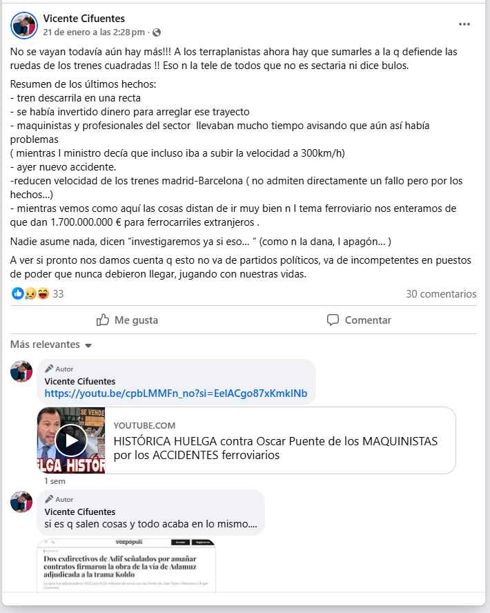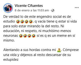 Lo relacionado con Vicente Cifuentes es un capítulo más breve porque no se esconde. Bastante crimen es seguir usando Facebook en 2026, pero al menos deja clarito lo que opina. No le pillas por dos likes tontos, le pillas porque está muy a gusto expresando lo suyo.