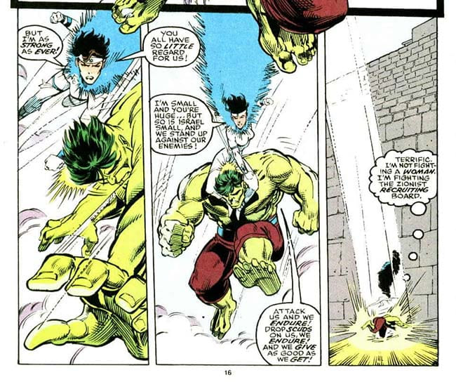 Podría ser la sibilina manera en que saca a Sabra en su Hulk y frente a la falsa equidistancia Ni De Derechas Ni De Izquierdas™ que muestra Bill Mantlo en el episodio en que la creó…